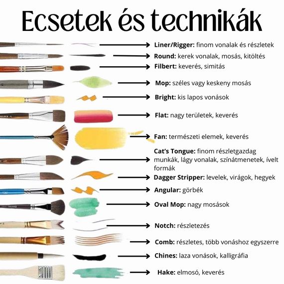 • Kerek ecset: Aprólékos, részletgazdag munkákhoz.